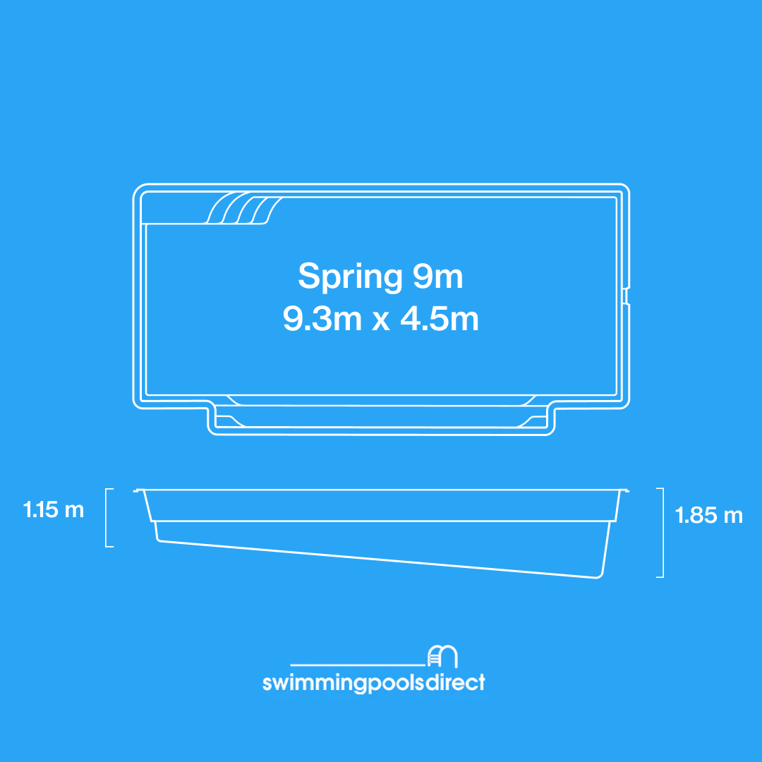 The Spring 9M is a large fiberglass pool but isn’t so large that it can’t fit in the average Australian backyard. The swimming pool is 9.3 meters in length and 4.5 meters in width. You’ve got safety ledges all around the pool for peace of mind. But for peace of heart you’ve also got a spa nook that you can add jets too.